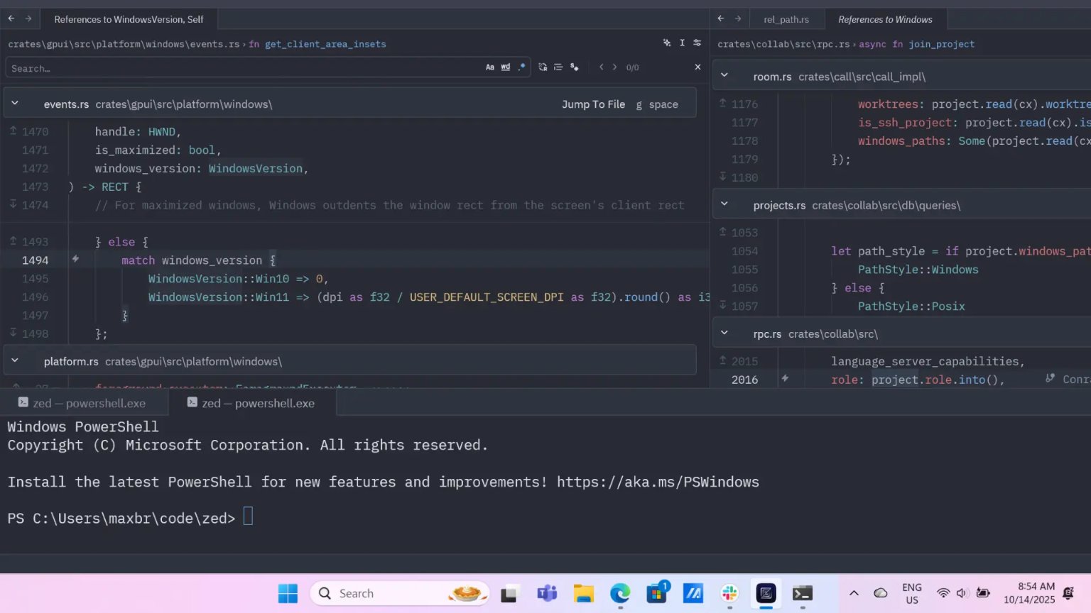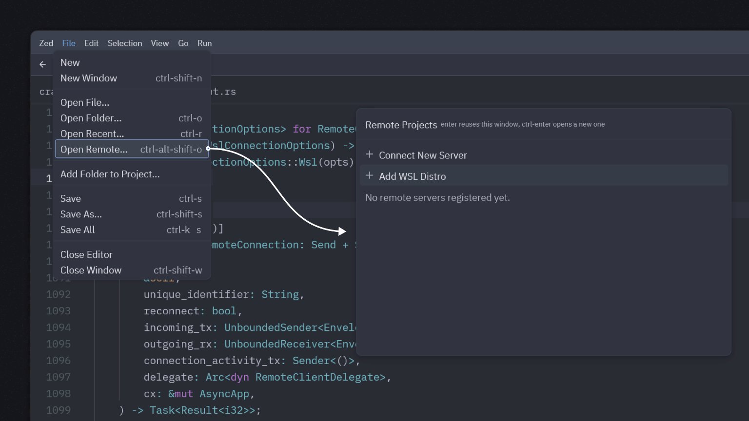 The Windows version also comes with integration with WSL (Windows Subsystem for Linux), enabling users to open folders and edit projects from any installed WSL distribution. Most features in Zed are designed to work with remote editing (WSL or SSH) in mind, including loading and saving files, Git integration, terminals, tasks, language servers, and debuggers.